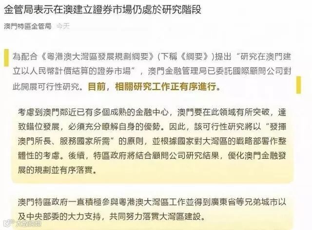 10月13日下午,澳门金管局表示,为配合《粤港澳大湾区发展规划纲要》提出“研究在澳门建立以人民币计价结算的证券市场”,澳门金融管理局已委托国际顾问公司对此开展可行性研究。目前,相关研究工作正有序进行。