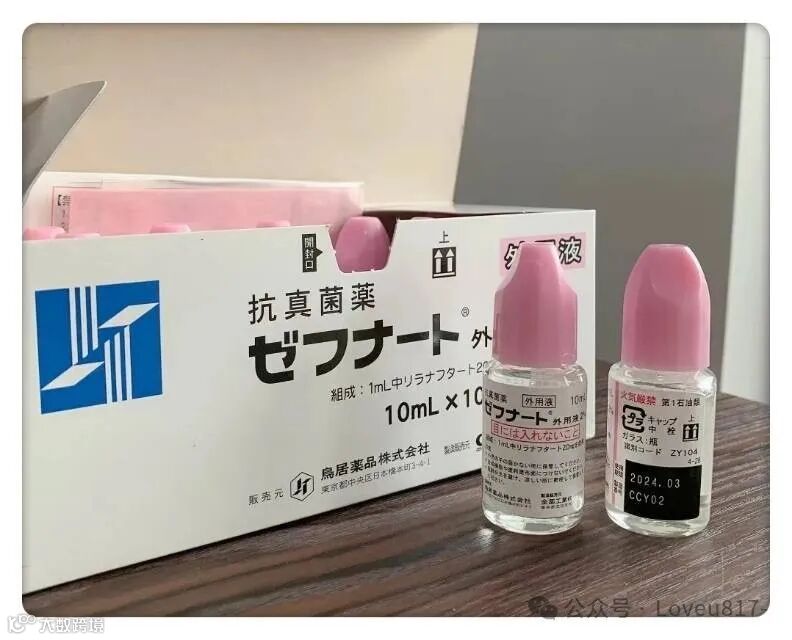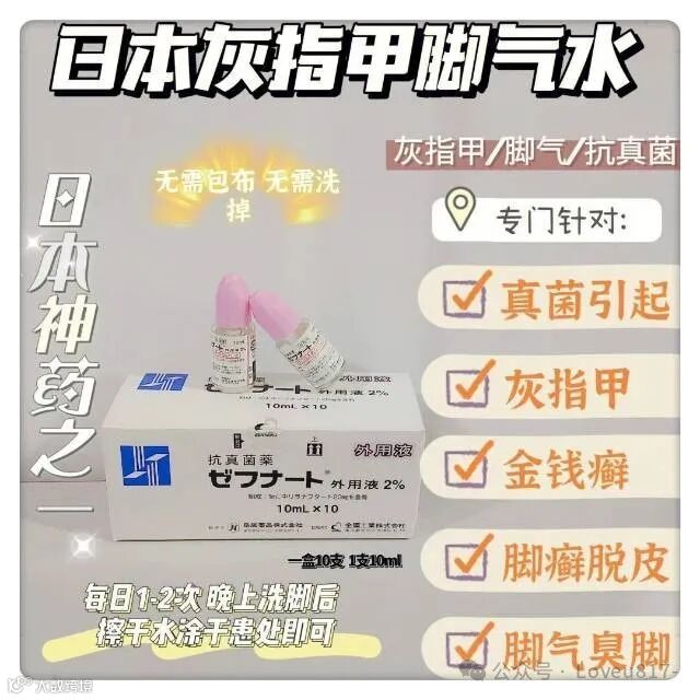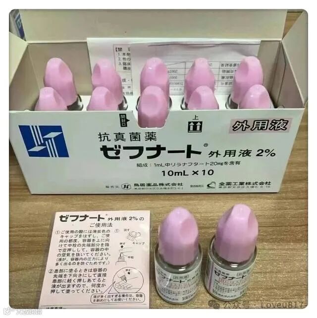日本处方脚气水是一种针对脚部真菌感染的药物,核心成分利拉茶脂,用于抑制皮肤浅表菌群症状如:足白癣,体癣,股部白癣等。可以阻碍菌群细胞膜角鲨稀环氧化反应,影响菌群细胞膜麦角固醇的合成,发挥抑制菌群作用。灰指甲,脚气,臭脚丫,脚癖脱皮,金钱癣都可以用!
