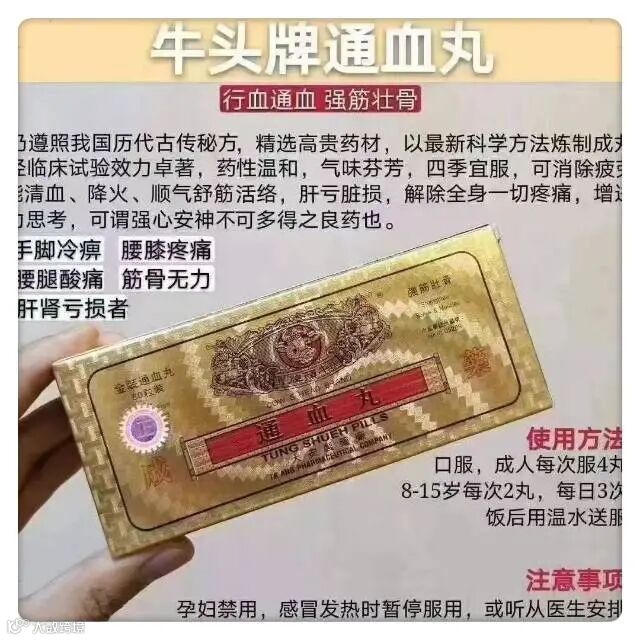 香港牛头牌通血丸遵照我国历代古传秘方,精选高贵药材,以最新科学方法炼制成丸经临床试验效力卓著,常用于改善血液循环、缓解瘀滞和活血化瘀,适用人群:舒缓肝亏脏损,四肢疲劳、辅助血液循环畅通,降虚火,清血络等。