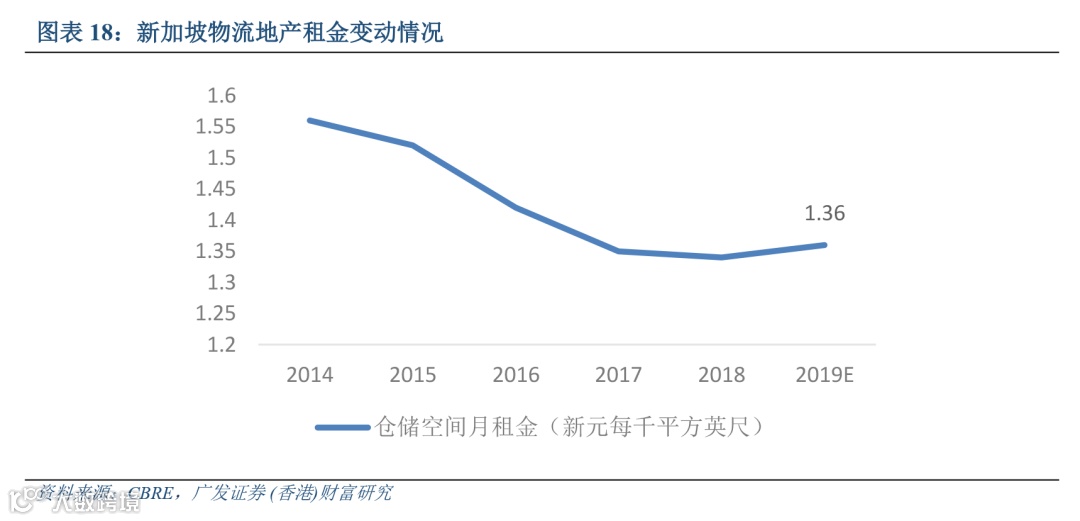 物流空间租金自 2014 年以来呈现持续下跌走势:2014-2018 年,新加坡优质物流空间月租金由 1.56 新元每平方英尺降低至 1.34 新元每平方英尺,但下跌幅度已趋于平缓。根据 CBRE 预测, 新加坡优质物流空间月租金于 2019 年将会轻微反弹至 1.38 新元每平方英尺,结束连续 5 年的下 跌。