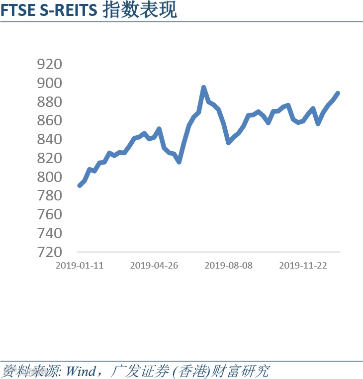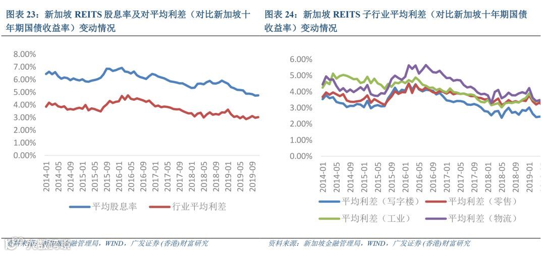 估值方面,以股息率、以及与同期新加坡十年期国债收益率相比的利差衡量,新加坡 REITS 估 值在过去 5 年总体呈现不断扩张的趋势。但在 2015 年,在中国股市去杠杆的背景下,中国 A 股 市场、香港股市和新加坡股市出现大幅调整,拖累REITS下跌,同期平均息差由3.69%大幅上升 至 4.25%,2016 年 4 月更上升至 4.76%,为 2014 年以来新高。随后两年由于全球股市的大幅上 扬,新加坡 REITS 走出牛市行情,股息率由 2016 年 2 月的 6.93%降至 2018 年 2 月的 5.34%,同 时由于无风险利率的不断上升,新加坡 REITS 平均利差在 2018 年 5 月收窄至 3.00%,创下 2014 年以来新低。而在 2018 年年中,贸易战成为黑天鹅,新加坡 REITS 出现调整。2018 年 12 月以 来,美联储重启降息周期,联储基金目标利率至今累计下降 75BP,新加坡 REITS 展现出类债券 属性,股息率由 2018 年 12 月的 5.79%降至 2019 年 11 月的 4.76%,创下过去 5 年新低,利差也 维持在 3%左右的历史低位水平。