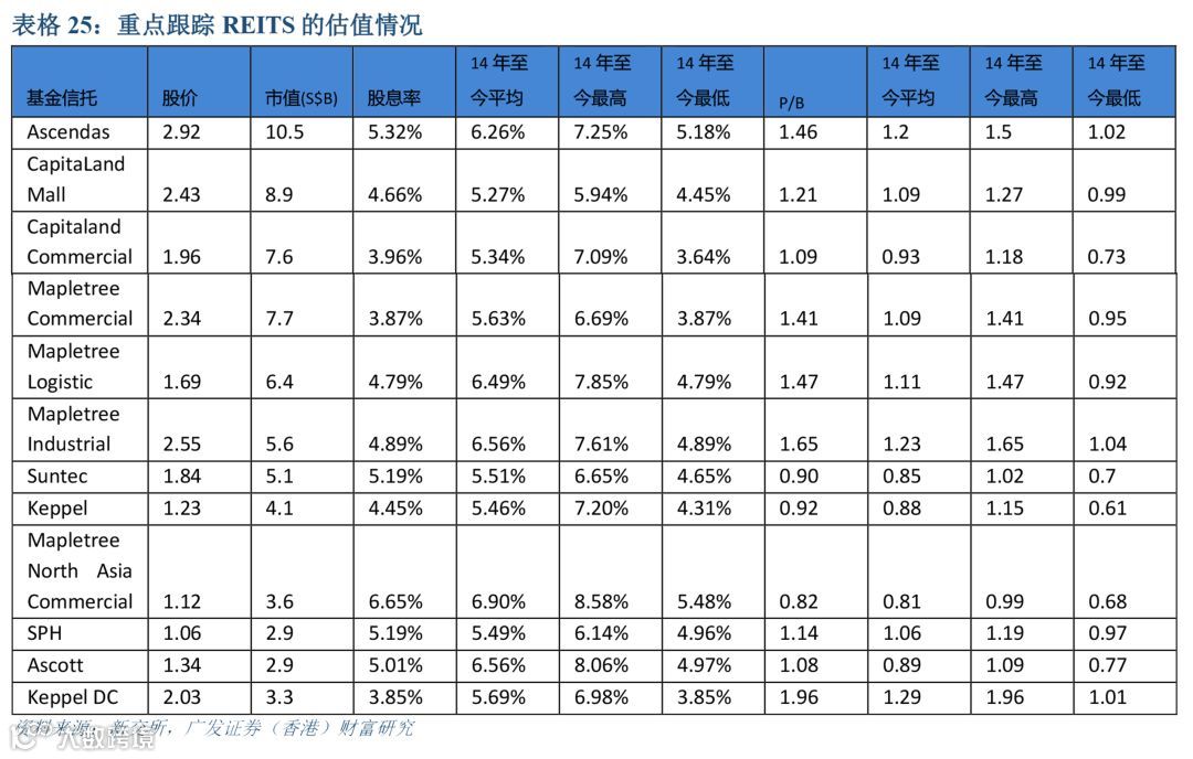 个股情况方面,我们重点跟踪的 REITS 估值,无论是从股息率还是市净率来看,整体处于 2014 年以来的高位。从股息率来看,Mapletree North Asia Commercial和Ascendas最高,分别为6.65%和5.32%, 而 Keppel DC 最低,股息率仅为 3.85%。从市净率高低来看,Keppel DC 以 1.96X 居首,Mapletree North Asia Commercial 以 0.81X 垫底。我们认为,目前板块的安全边际严重不足。