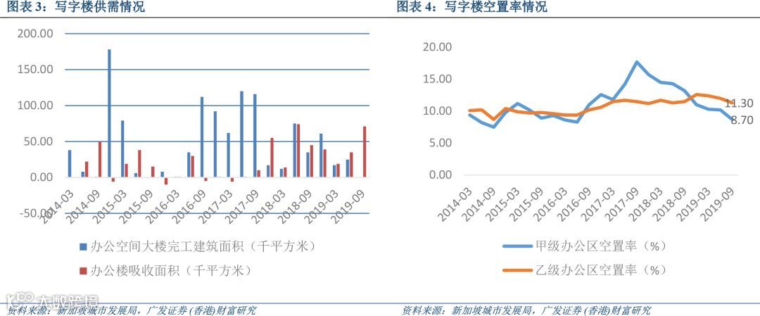 得益于来自金融、IT 及共享办公的强劲需求,新加坡写字楼供需关系持续向有利于物业持有人 的方向发展。净吸收量继在 2018 年达到 17.2 万平方米后,于 9M19 达 12.5 万平方米,继续保持 在 2014 以来的高位。受此影响,写字楼空置率得到持续改善,其中甲级写字楼空置率实现连续 八个季度的下降,3Q19为 8.7%,为过去五年的低位。