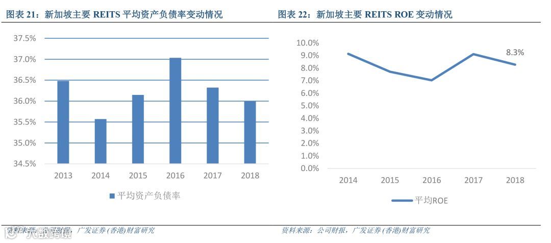 从ROE来看,2014-2018年新加坡主要REITS平均ROE在7.0%-9.1%之间波动,平均值为8.2%。2018 年平均 ROE 为 8.3%,虽然同比有所下降,但仍高于 2014 年以来的均值,并且由于同期行 业正在经历去杠杆,因此我们认为行业的经营质量正在提升。