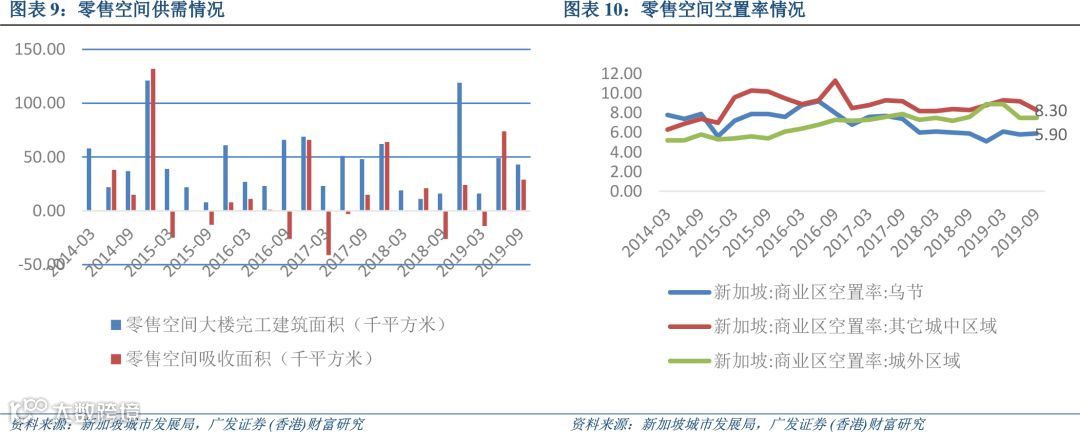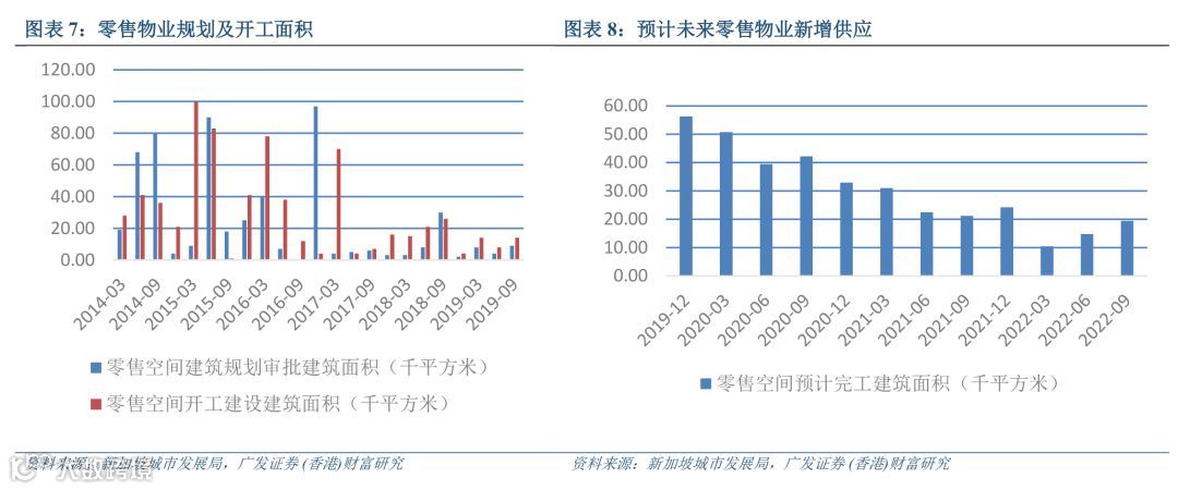 新加坡零售物业存量面积维持温和增长。截止 2019年三季度末,新加坡零售物业总面积为 62.01 万平方米,同比增 1.9%,增速高于过去四年平均水平。供应的较快增长主要来自于 2017 年以前 的数额庞大的建筑订单的滞后效应,而该数量在 2017 年以后已经大量萎缩。因此,我们预计 19Q4至 22Q3期间,季度零售物业新增供应将会逐渐从 5.63万平方米降至 1.95万平方米。
