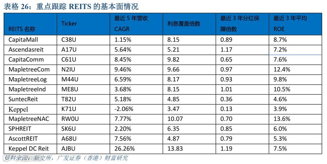我们以重点跟踪样本 REITS 最近 5 年营收 CAGR 的均值 6.8%为界限,将样本划分为成长型和成 熟型。在成长型 REITS 中,大多数拥有较好的偿债能力,但在分红保障能力和 ROE 方面参差不 齐。其中数据中心龙头 Keppel DC 在各项指标上一骑绝尘,最近 5 年营收 CAGR 高达 26.26%, 最新利息保障倍数和最近 3年分红保障倍数分别为 13.83和 1.19,均排名第一,但 ROE低于平均 水平。MapletreeCom以 9.46%的 5年营收 CAGR紧随其后,同时最新利息保障倍数、最近 3年分 红保障倍数和最近三年平均 ROE分别达 9.66%、0.97和12.4%,均明显高于平均水平,各项指标 均衡无短板。CapitaComm和 MAPLETREENAC也较为优质,不同之处是前者展现出更高的成长 性,而后者在财务安全性和 ROE 方面表现更优。AscottREIT 在除成长性之外的指标上乏善可陈。