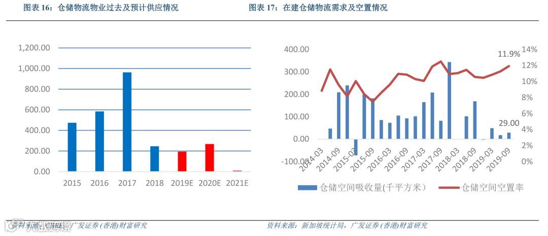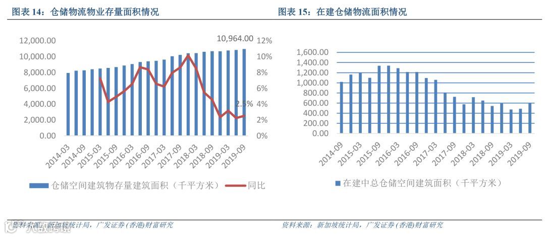 经过了 2015-2017 年的井喷,新加坡物流地产扩张逐渐放缓。截止 2019 年三季度末,新加坡物 流地产存量面积为 1,096万平方米,同比增 2.5%,增速处于过去 5年低位。在建面积也表现出相 似的趋势,物流地产在建面积在过去四个季度季均均低于 60万平方米,不及 2015年峰值的一半。