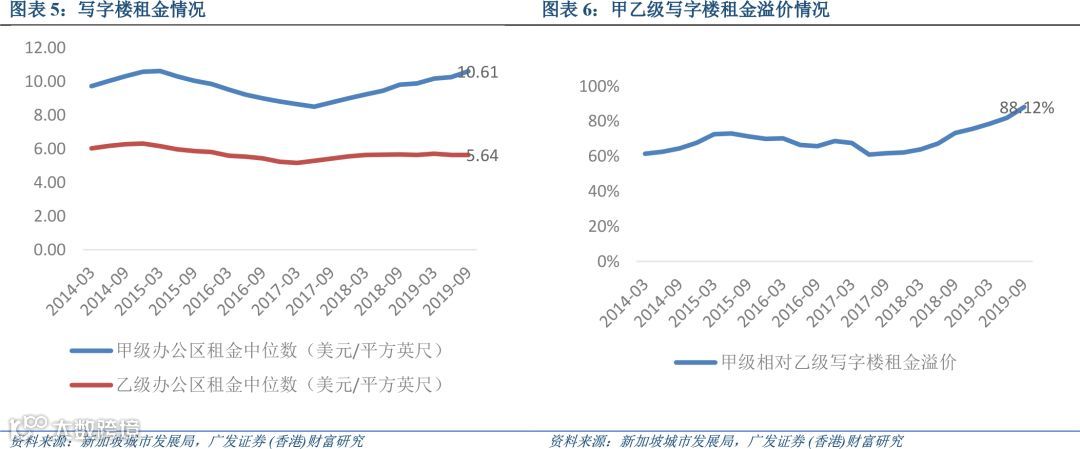 得益于供需关系的改善,写字楼租金水平继续回升,尤其以甲级写字楼表现更为强劲。截止 3Q19,甲级和乙级写字楼租金中位数分别为 10.61 美元/平方英尺和 5.64 美元/平方英尺,同比分 别增长 8.15%和-0.35%,其中甲级写字楼租金水平已接近过去五年最高水平。同时,甲级相对于 乙级写字楼租金溢价率最新读数为 88.12%,创下过去五年新高,显示市场分割情况依旧显著。