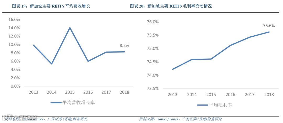 从经营绩效来看,新加坡主要REITS表现稳健。业绩增长在2013年-2015年经历了大幅波动后, 新加坡 REITS营收增长率从 2016年以来触底反弹,2016-2018年分别为 6.0%、8.0%和 8.0%。同 时盈利能力也在同步提升,2013-2018 年,平均毛利率连续走高,2018 年达到 75.6%,处于 2013 年以来最好水平。