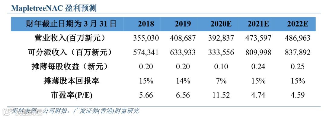 MapletreeNAC 是丰树集团旗下专注于投资北亚商业不动产的基金信托平台。基金信托的物业 组合位于香港、中国大陆和日本,其中位于香港的综合体又一城是最大的收入来源。截止 2019 年 3 月 31 日,基金信托拥有可出租面积约 420 万平方英尺,总物业估值 76 亿新元。FY18/19 财 年基金信托实现营收 408,687 百万新元,同比增长 15.1%,净物业租金收入 329,030 百万新元, 同比增长 14.6%,实现净利 634,412百万新元,同比增长 10.5%。关注理由如下: