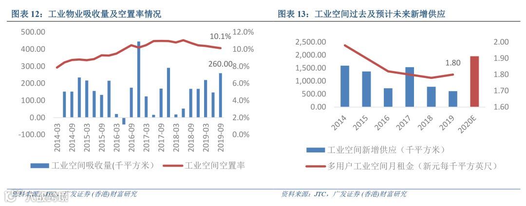 需求方面则表现出韧性。Q318-3Q19 工业空间季均吸收量为 19.3 万平方米,高于 2014 年以来的 平均水平。受此影响,工业空间空置率虽然整体处于高位,但实现了自 18Q2 以来的持续改善, 19Q3降至 10.1%。租金水平于 2019年止跌回升,月租金为 1.8 新元每平方英尺,同比增 1.1%。