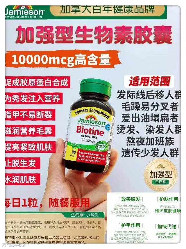 JAMIESON健美生生物素,脱发严重、有白发、头发干躁总分叉?护发产品怎么用都没效果, 根源营养不够,表面功夫做得再好也白搭,健美生10000mcg高浓生物素,深度滋养毛囊,助你轻松get氛围感瀑布长发!