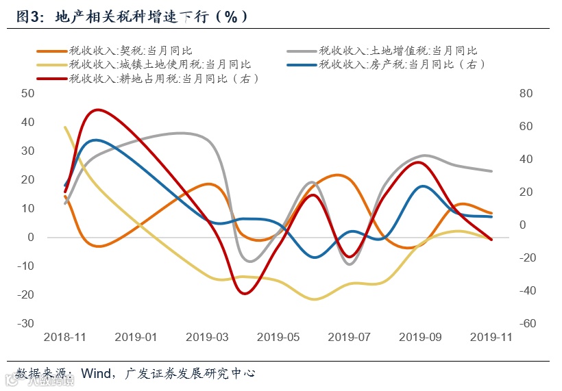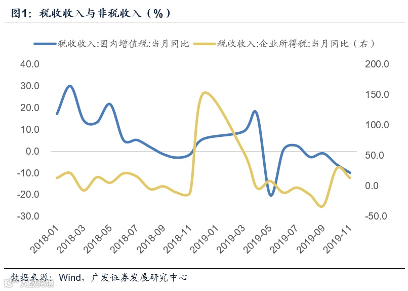 从几大主要税种来看,11月税收收入增速偏低的主要因素有:第一,占税收比重约三分之一的国内增值税降幅扩大3.8个百分点至-9.7%,拉低全国公共财政收入增幅3.6个百分点;第二,企业所得税增幅下降15.9个百分点至13.9%、国内消费税增幅下降48.5个百分点至60.9%、地产相关税种增幅均有所下滑,因此本月合计占税收收入比重约为45%的相关税种收入边际贡献较上月转弱。仅个人所得税、进口环节税、关税增速有所回升,但这些主要受低基数因素影响,参考意义较小。