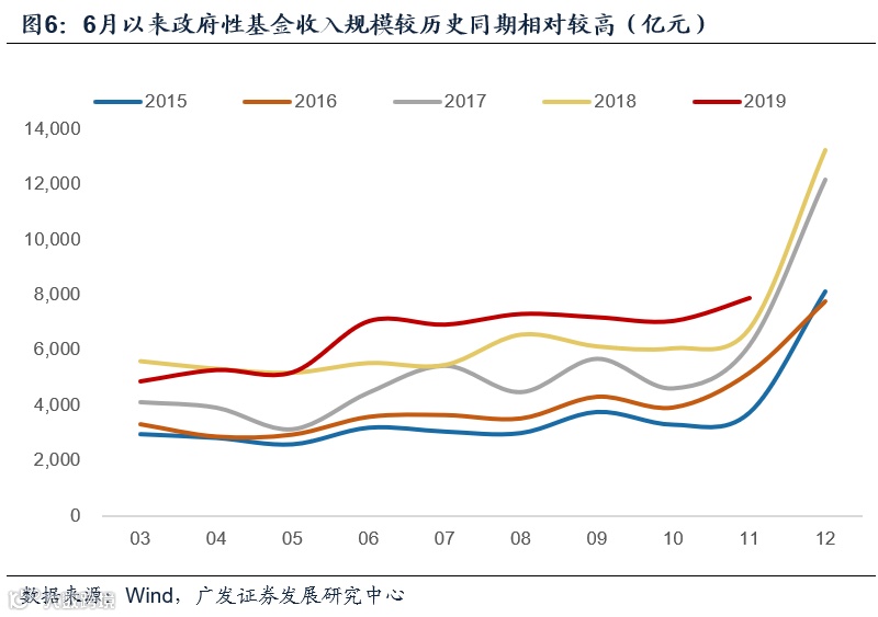 根据季节性,年末的12月往往是财政支出规模较高的月份。但由于今年财政节奏前倾明显,12月的不含财政调节项的支出力度估计会弱于历史同期季节性:简单测算下,若全年财政支出恰好完成年初预算水平,则12月支出数预计约为16800亿元,弱于历史同期;若全年财政超支3%[2],则12月支出数预计约为23500亿元,仍略弱于近五年平均水平25200亿元。