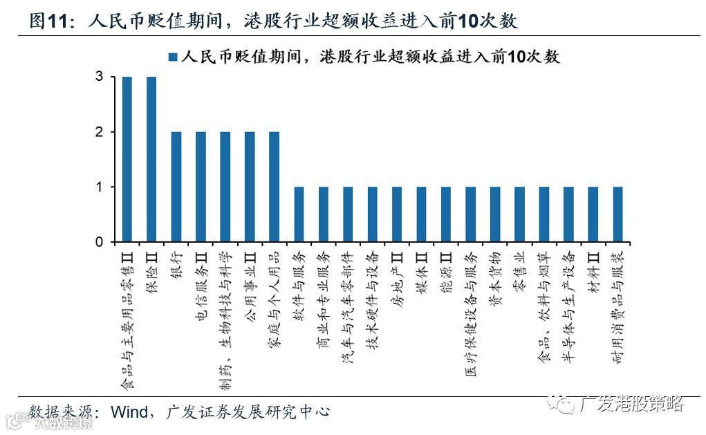 人民币贬值对各行业影响各异,借鉴历次人民币贬值周期的行业表现经验,预计港股主要有两类行业或存在相对收益: