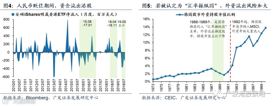 第一,人民币“快贬”期间,跨境资金倾向于流出港股市场避险。2015年以来3次人民币快速贬值期间(2015.08—2017.01、2018.04—2018.11、2019.05至今,图10),由于对汇率走势不确定性的担忧,加上汇率波动对于人民币资产估值的压制,跨境套利型的外资倾向于短期避险。从数据来看,历次人民币“快贬”期间,挂钩港股的ETF多数时间表现为净卖出。