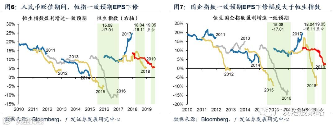 港股市场和人民币汇率的短期波动高度相关,人民币“快贬”对港股市场最显著的影响体现在两方面:1)短线资金避险,即“杀估值”;2)EPS预期下修,即“杀盈利”。“快贬”既杀估值,也杀盈利。
