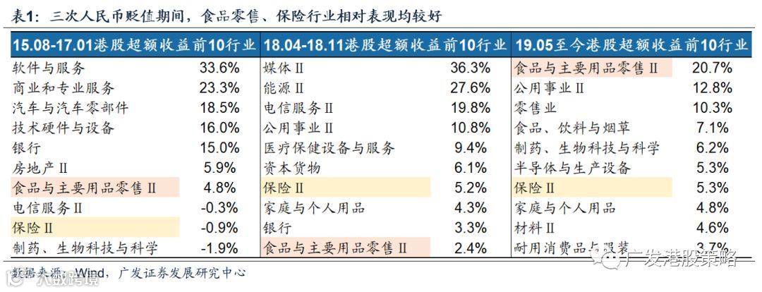 借鉴历次人民币贬值周期的行业表现经验,预计港股主要有两类行业或存在相对收益: