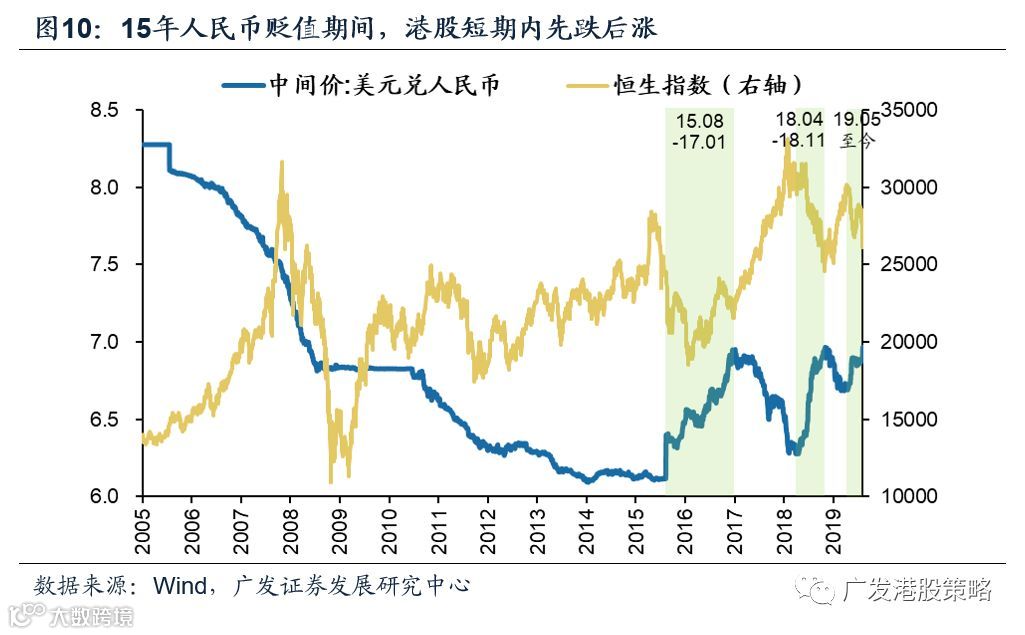 综合来看,人民币“快贬”短期之内对于港股市场往往是“不能承受之重”。15年“汇改”之后,人民币“快贬”整体不利于港股市场,尤其对于中资股而言,往往带来估值和盈利下修压力的集中释放。