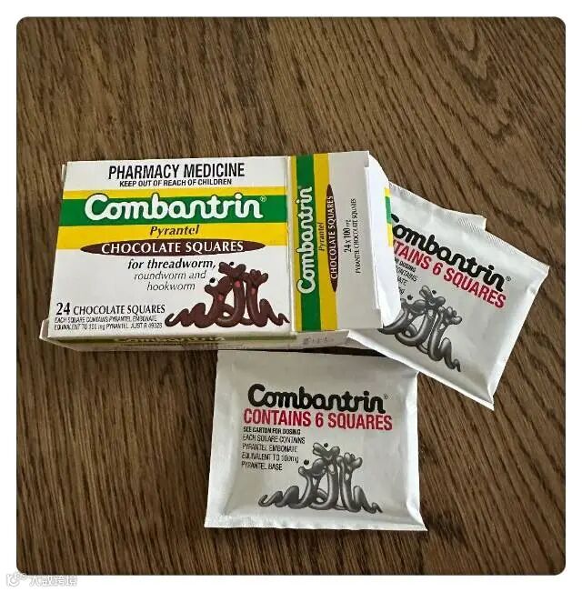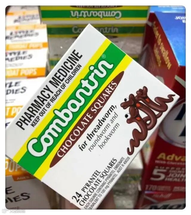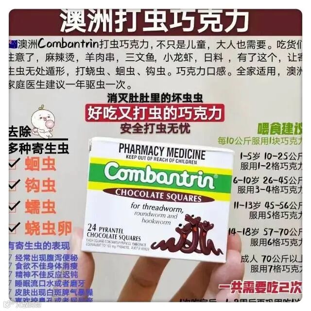 澳大利亚的驱虫药,打虫巧克力如果孩子胃口不好、喜欢挖鼻孔、注意力不集中、脾气暴躁易怒、睡觉磨牙流口水,不明原因的腹泻或便秘等,可能需要打虫。澳大利亚医生建议每个家庭每年打虫一次,大人可吃,特别是常吃生鱼片,烧烤、小龙虾的人群。