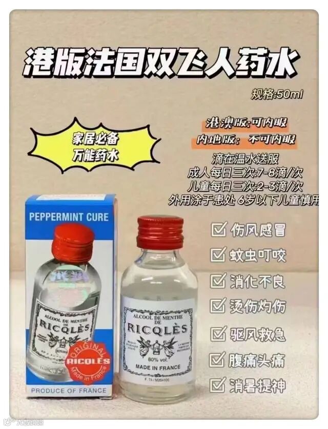 法国双飞人药水50毫升装与内地版本的主要区别在于其使用方式:法国的双飞人药水是可以食用的。当出现拉肚子、肚子痛、晕船、头晕等不适症状时,可以选择口服。而内地版本的双飞人药水则不可口服。从包装上就能明显看出这一区别,香港版本的包装上标明“可内服”,而内地版本的包装则注明“不可内服”。这足以说明两个版本的成分存在差异。