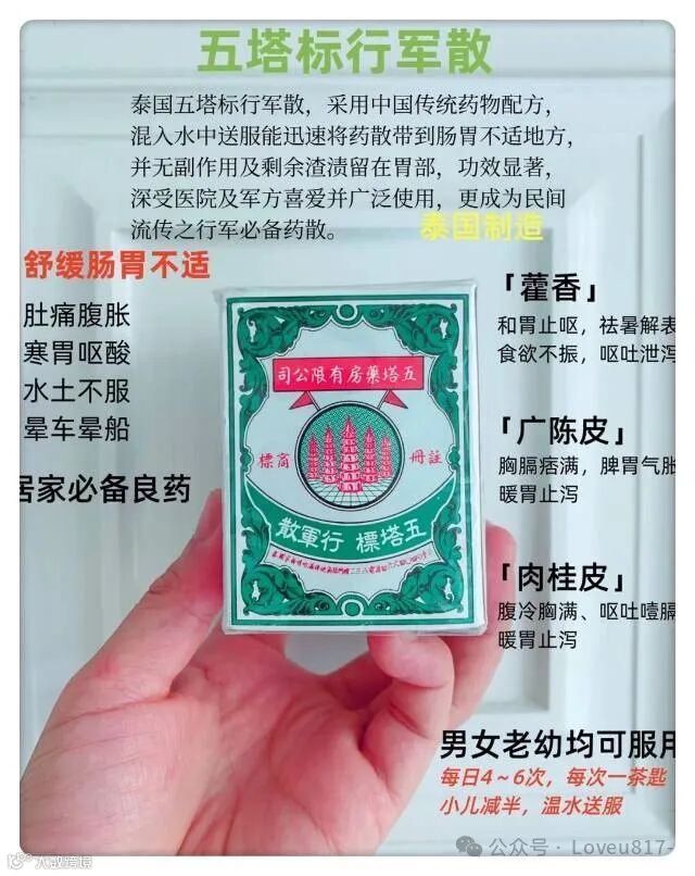 从小吃到大的五塔行军散每次去香港图买5瓶打底,腹胀或腹泻、头晕吃了痊愈得很明显,当然,男女老少皆可用的一款,我妈妈也是有些小症状就吃这个。