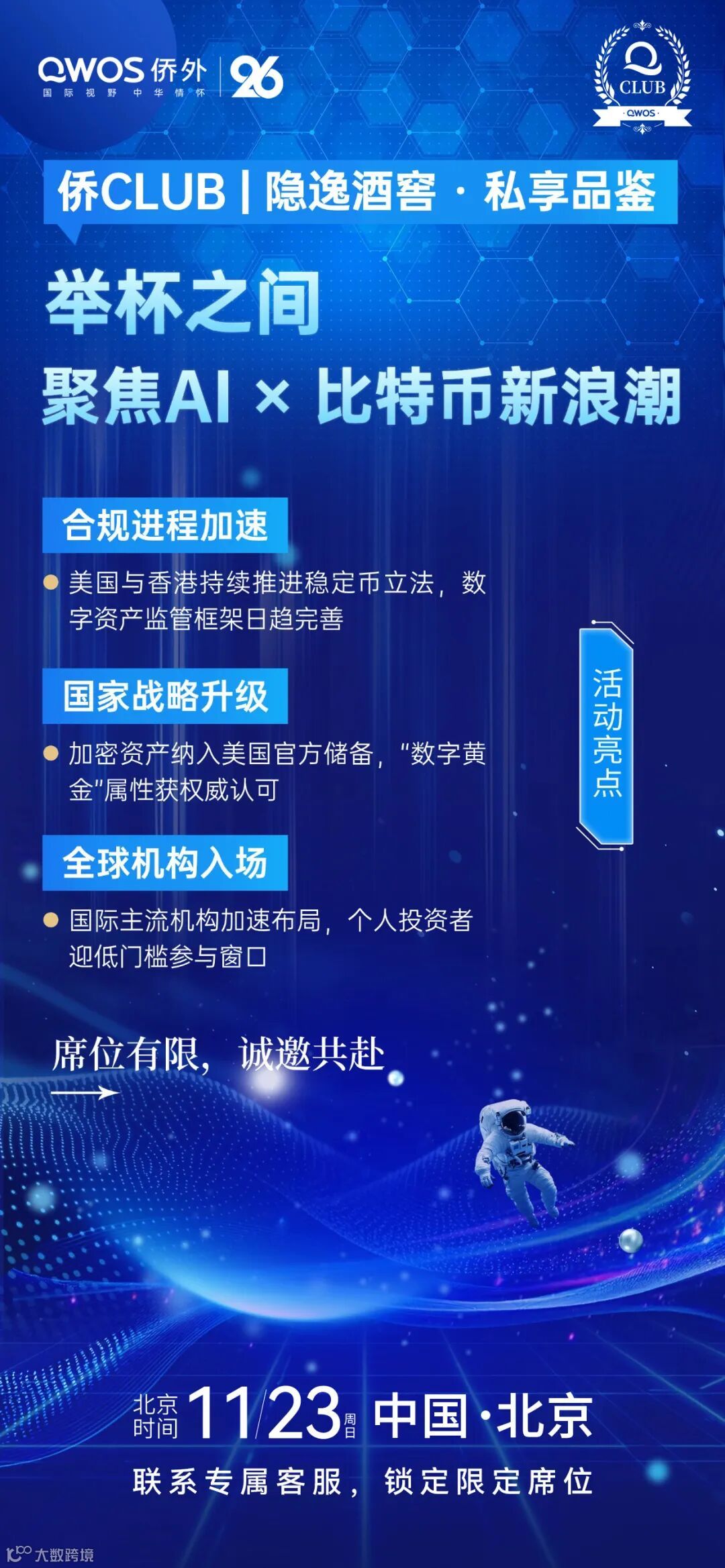 11月23日于顶级酒窖,侨CLUB将在红酒的醇香摇曳与私享品鉴中,开启一场关乎未来的财富对话。在全球经济图景剧变的当下,数字货币正成为不可忽视的资产类别。