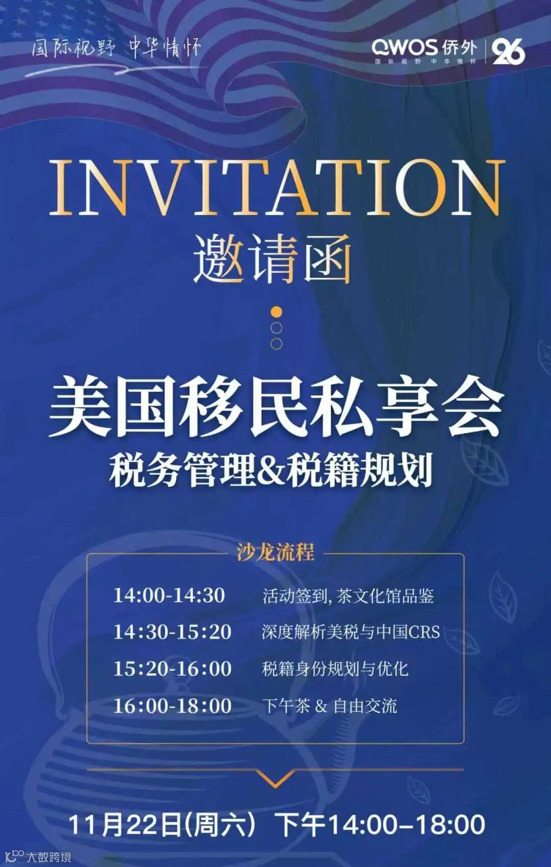 为此,11月22日下午,侨外将在广州举办“财税与传承私享会”,聚焦全球税务透明化趋势,特邀美国资深税务专家,深度解析美中税务合规与资产规划策略,助您在国际背景下实现财富稳健传承。