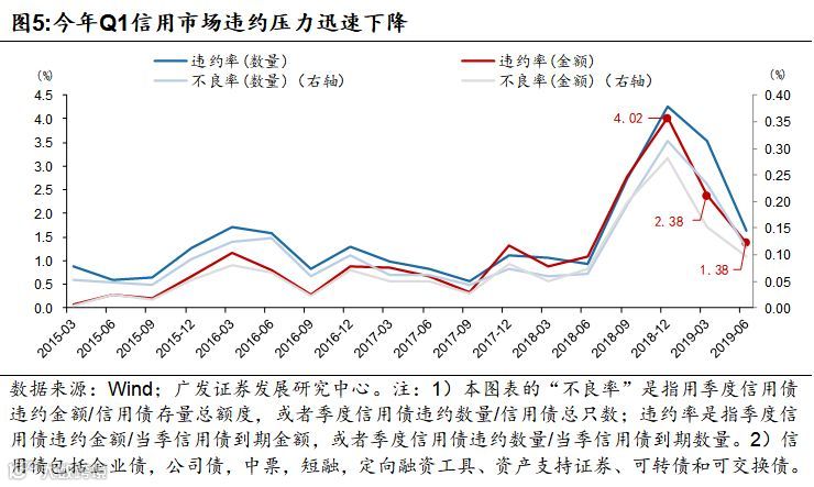2019年Q1政策层面延续2018年Q4以来的宽信用导向,重点疏通货币政策传导机制。宽信用政策积极推动社融放量增长,Q1社融同比增速接近40%。货币环境条件亦有修复,M1和M2增速缺口持续收窄。金融条件修复驱动融资环境改善,社融和名义GDP增速缺口反弹;市场违约风险收敛,企业违约率下降。