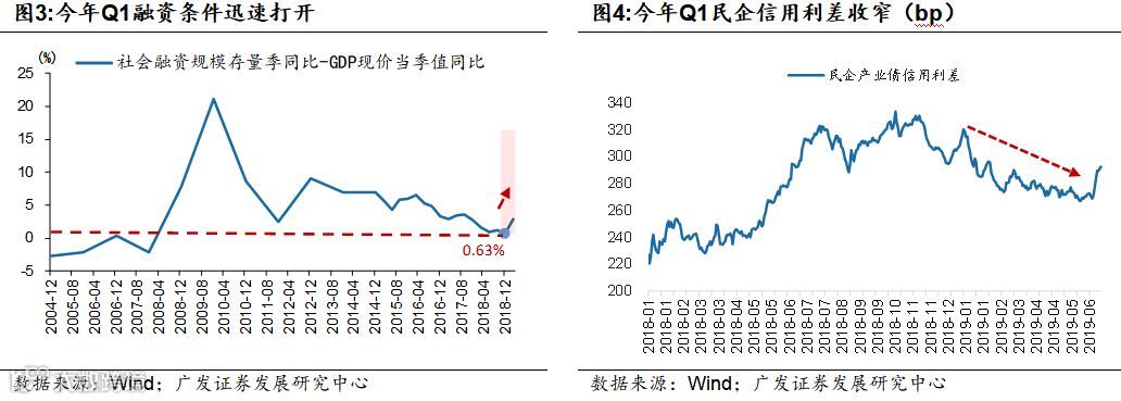 今年一季度融资环境显著改善。2018年去杠杆,信用条件收紧。去年社融和名义GDP增速差值不断压缩,缩至四季度的0.63%,是2008年以来的最低水平。基本与2006年Q4相当。要知道2001~2007年中国加入WTO,信用扩张和货币派生速度较快,融资环境持续处于收紧状态。2008年以后,货币和金融条件大方向上趋势宽松,然而2018年融资环境几乎和2006年相当,可见2018年融资环境之紧。伴随着社融放量,今年融资环境明显改善,社融和名义GDP增速差值反弹至一季度的2.85%。