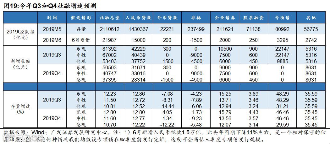二,外部环境没有继续显著变化,但保留不确定性;政策稳增长同时金融供给侧改革推进,宏观逻辑可以概括为“经济退、政策进、阶段性信用收缩”,类2018年三季度,对应社融中性估测。这种情况下,企业债券融资(尤其中低评级债券)以及非标融资受冲击,人民币贷款或有抵补。假设全年新增人民币贷款增速8%,估计下半年新增人民币贷款7.08万亿。中性情境下非标融资按照月均-3000亿元假设,和去年下半年月均-3376亿元的水平相差无几,企业债券融资月均2500亿元,也与去年下半年月均融资相差无几。稳增长的政策导向下专项债发行扩容,并假设用完去年剩余的1.23万亿限额空间,进一步假设专项债在9月底发行完毕。估测得到Q3和Q4社融存量增速分别为11.5%和11.6%。