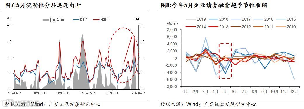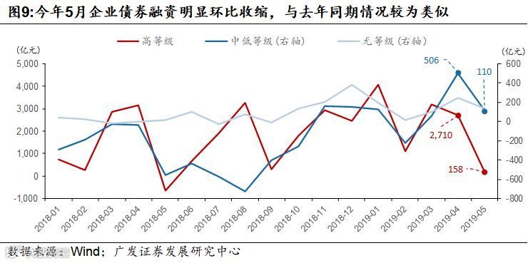二季度流动性结构性收紧并且信用收缩压力略有显现。包商银行事件标志同业刚兑打破先河,随后市场流动性迅速结构性收紧,同业存单和信用债利差也在逐步走阔。此外,5月企业债券融资环比大幅收缩3371亿元,缩幅超过季节性表现。今年5月企业债券融资中的高等级债券融资缩幅尤为明显,与去年同期情况较为类似。考虑到同业破刚兑延续“货币流动性冲击-->非银和中小银行流动性紧缺-->企业债券和非标融资收缩压力-->信贷收缩压力”传导路径。我们倾向于认为5月企业债券超季节性收缩指向同业破刚兑对应的信用收缩压力有所显现。