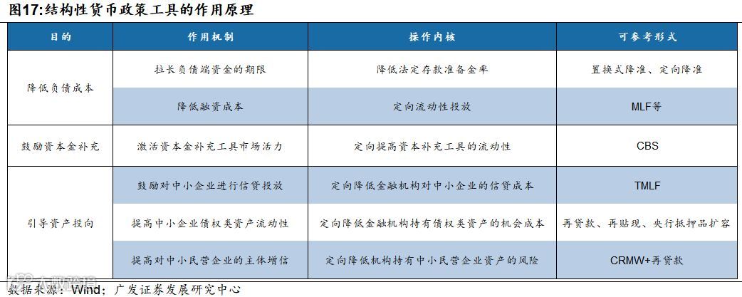 二元信用和流动性分层现实情境下,未来结构性货币政策工具仍将从降低金融机构的负债成本、鼓励补充资本金、引导资产投向三个方面进行调控。值得注意的是,为有效降低金融机构对中小企业信贷成本,未来不排除有定向降息的结构性货币政策工具。