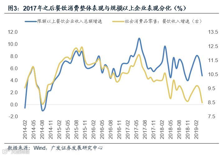 一)餐饮收入。餐饮收入增速在2012-2013年曾有一轮大幅下行,2013年一季度统计局指出餐饮数据大幅回落“一定程度上说明公款的消费受到一定的抑制”;2014-2015年低基数和大众消费推动餐饮增速部分修复;17年以后的一个重要特点是限额以上与总量走势的分化,限额以上整体平稳,即餐饮需求更多向规模型企业集中。我们猜测这一过程可能部分和本地生活O2O发展、城市环境综合治理有关,即总量部分收缩也并非源于需求收缩,同时规模以上企业表现平稳。