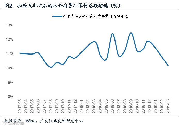 第二,扣除汽车之后的社零:2017年之后并未有趋势下行。