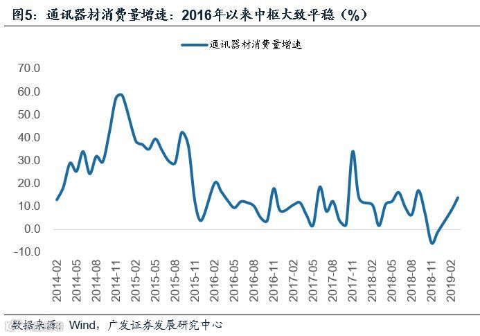 三)手机销量。从通讯器材零售或者手机出货量数据看,这一领域已不复红利期的超高增速,但2016年后增速中枢基本稳定,并未有趋势性下降,且这一消费未来还会受到消费电子代际技术更新脉冲的影响。