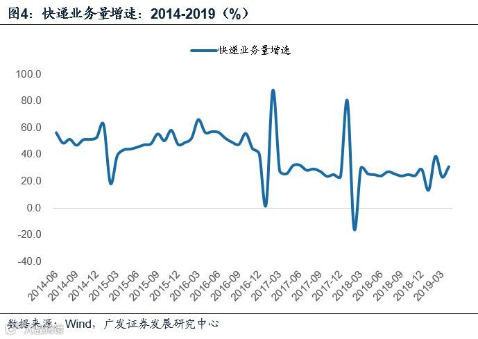 二)快递业务量。线上消费已是消费增量市场中最主要的部分。网上商品和服务零售额数据似乎处于增速下行区间。但这一数据和社零总量数据一样存在口径切换后的可比性问题;且2016年底-2018年初是线上消费增速抬高期,后续增速回落一定程度上源于基数。有两个影子指标似乎更值得关注,一是规模以上快递业务业务量增速,近年基本平稳(图);二是代表性的电商平台的GMV,增速依旧平稳。