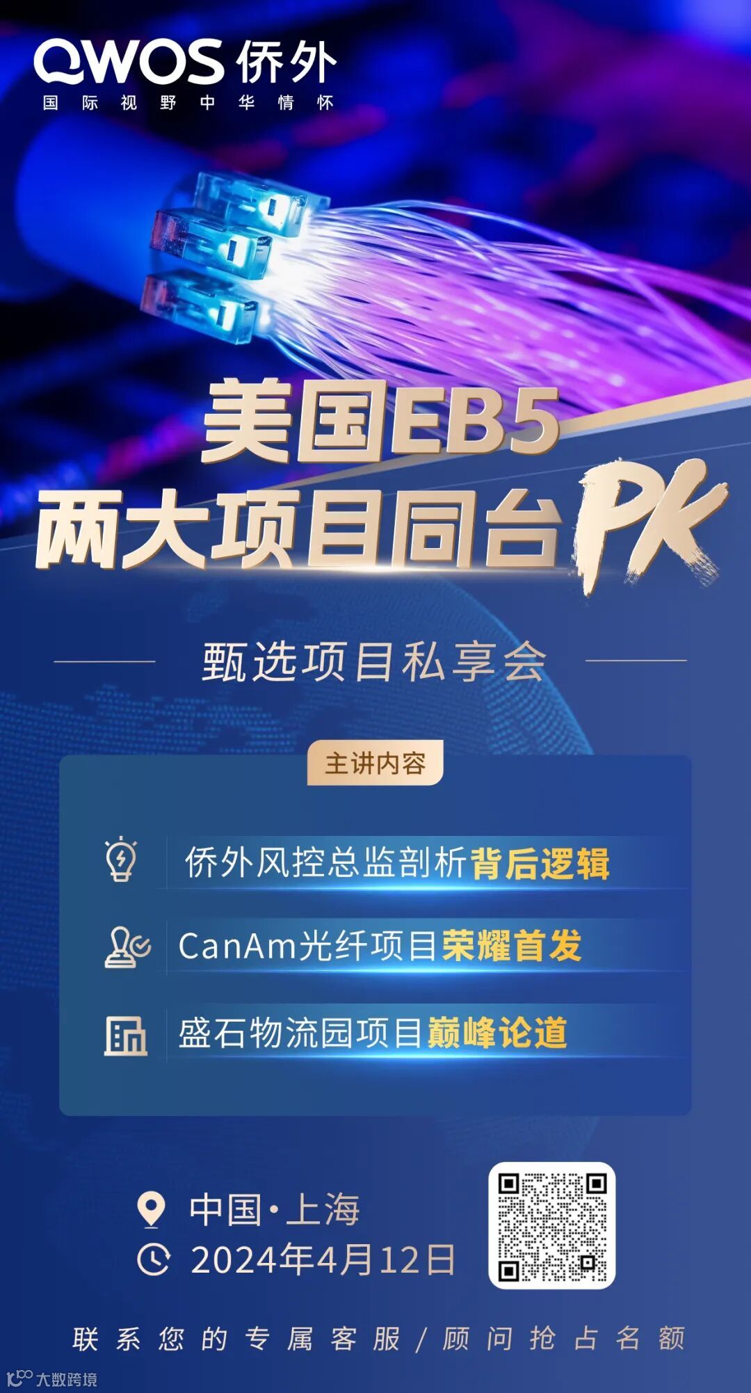 4月12日本周六,侨外出国将举办“美国EB5两大项且同台PK”私享会,为您带来一场高规格的项目甄选盛宴!
