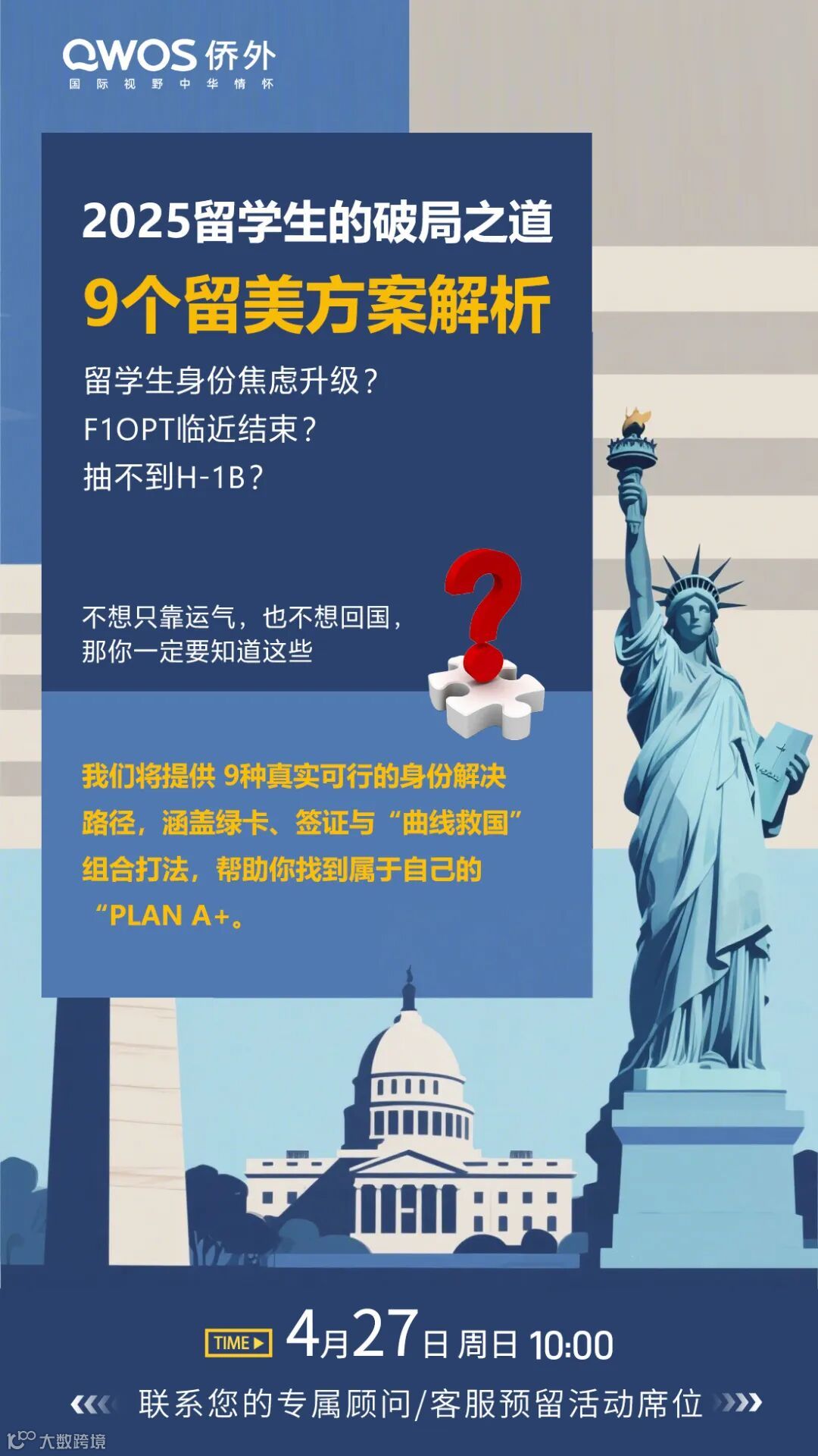 面对日益收紧的美国移民政策,F-1被撤销和H-1B抽签失利已成为留学生最大的焦虑来源。本次讲座将特邀美国移民专家深度解析2025年最新可行的9大留美方案,为面临身份困境的留学生提供专业解决方案。