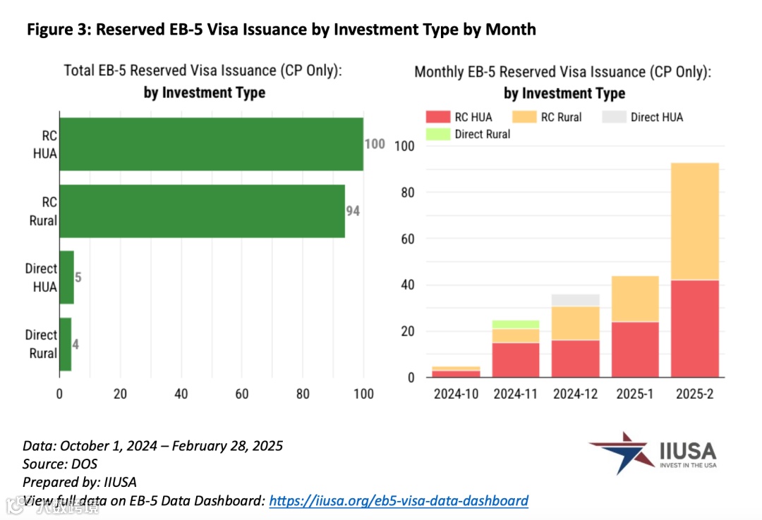 报告显示,2025财年前五个月,仅签发了98个新政EB-5乡村地区预留签证和105个高失业地区预留签证。这意味着乡村地区的签证使用率仅为2%,高失业地区的签证使用率仅为5%。(未包含通过USCIS身份调整申请的EB-5签证使用情况。)