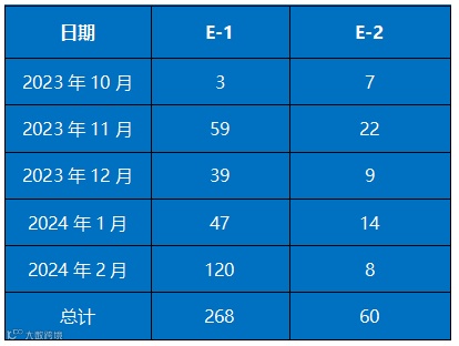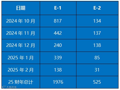 侨外出国也根据美国国务院的海外领馆移民签证发放数据,总结了2025财年前五个月的E1类别(即职业类移民EB-1)和E2类别(职业类移民EB-2)的相关数据。