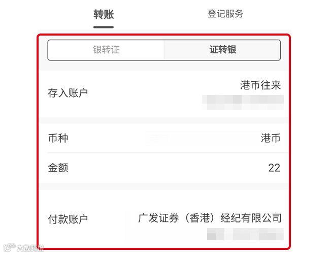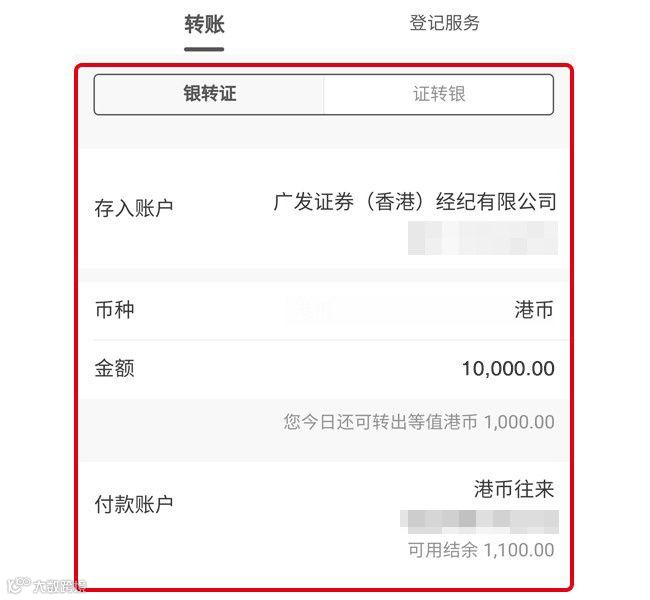 ① 有部分券商支持银行端发起的证转银交易。选择对应的账户后输入转账金额。