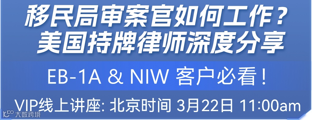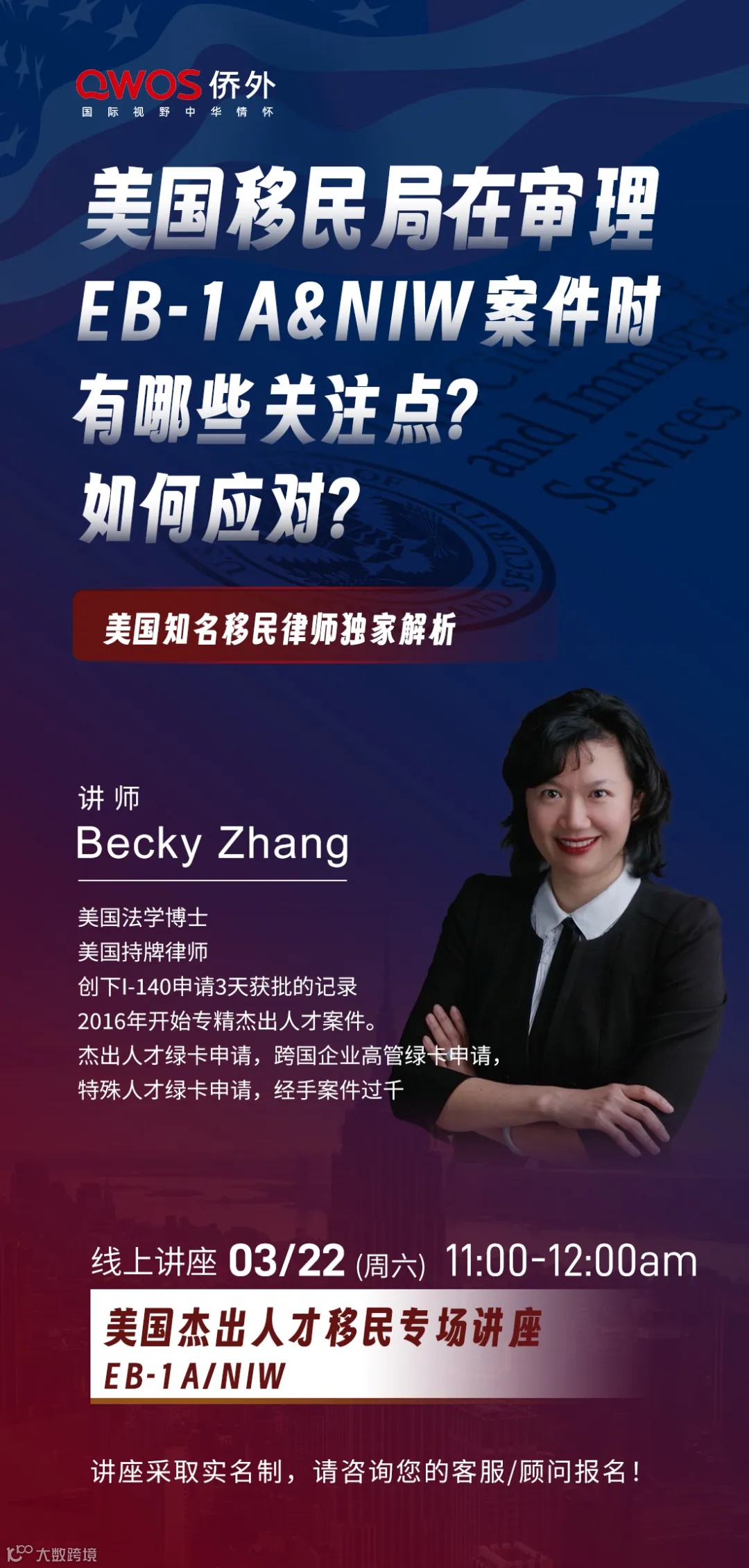 对EB-1A&NIW感兴趣的朋友,欢迎参加侨外出国3月22日上午11点举办的讲座活动,我们特邀美国知名移民律师为大家讲解USCIS审理EB-1A&NIW案件的主要关注点、EB-1A&NIW的政策更新以及特朗普执政对人才类移民的影响。内容丰富,干货满满,快联系您的专属顾问客服报名参加吧!