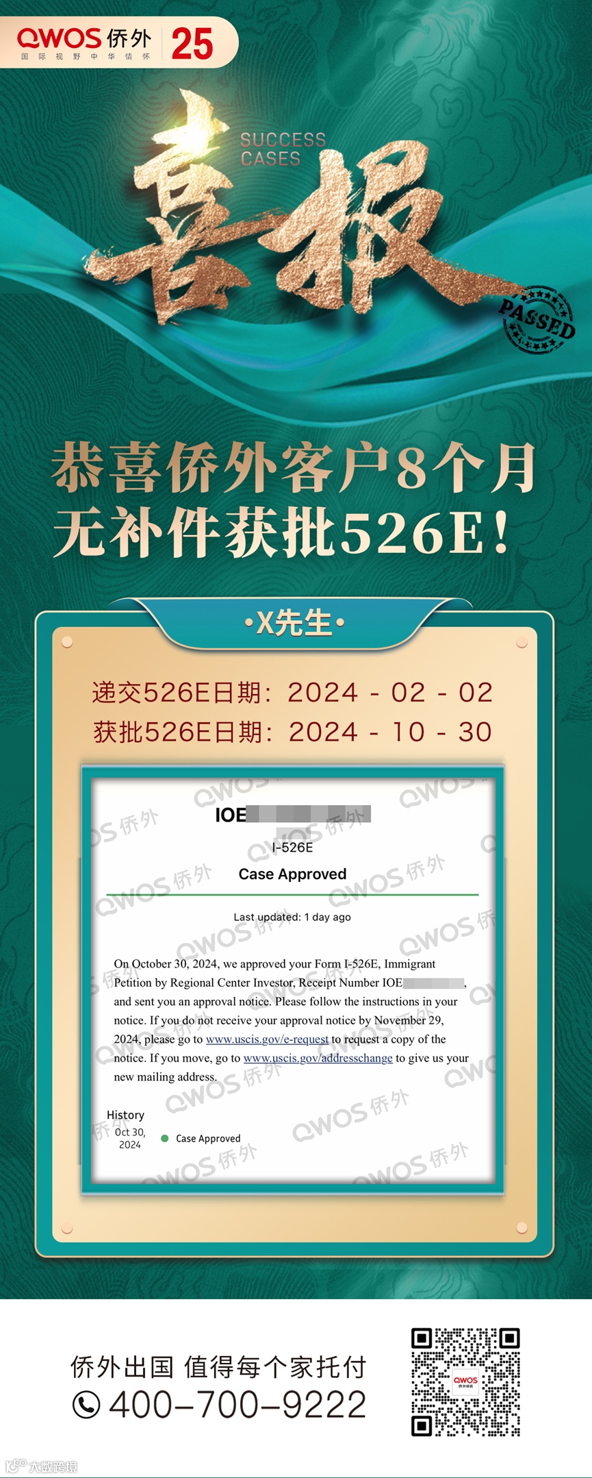 近日,侨外又有一位EB-5新政的申请人仅用8个月的时间,就顺利通过了I-526E的审批,并且整个过程中未收到任何补件要求↓↓信赖专业,选择侨外就对了!