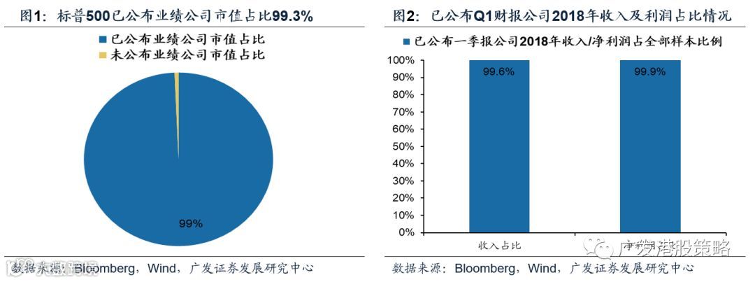 选取财报季于3月底结束的标普500指数成份作为样本,截至5月10日,已有426家公司公布一季度业绩,市值占全部样本的99.3%,2018年收入和净利润占总样本比例接近100%,已具有很强代表性。