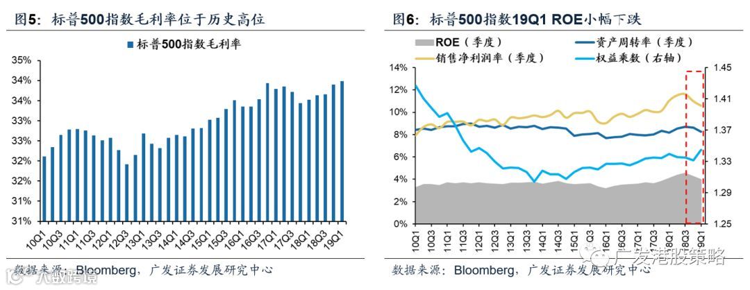 从盈利能力与盈利质量看,ROE回落幅度较小,主要受杠杆率提升支撑。19Q1标普500指数毛利率小幅上涨至34.0%,仍位于高位,ROE(TTM)回落至11.6%。从ROE杜邦三因子看,净利润率、资产周转率同时走低,杠杆率明显上升。目前标普500指数杠杆率位于2010年以来中值附近,未来仍有上涨空间但较为有限。