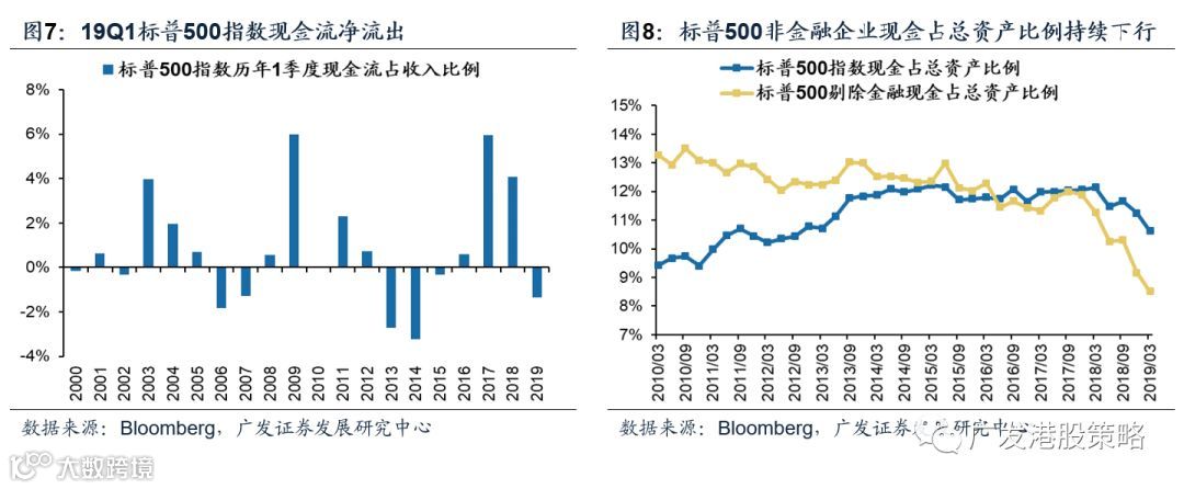 现金流状况恶化。19Q1标普500指数净现金流占收入比例转负,为近5年来最低水平。现金流净流出的同时,现金占总资产比例同样显著下滑,且非金融企业现金占比下滑幅度更大,标普500非金融现金占总资产比由去年同期11.3%下滑至8.5%。