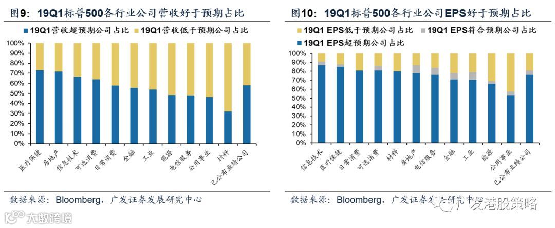 综合来看,一季度58%的公司收入好于市场预期,比例与过去5年平均水平持平,76%的公司EPS好于市场预期,比例高于过去5年平均水平(72%)。因此尽管19Q1收入、盈利仍位于下行周期,但由于市场预期更为悲观,19Q1业绩反而对美股走势形成一定支撑。