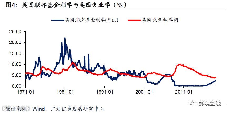 理由一:美联储认为美国失业率即将触底回升。历史上美联储只在美国失业率回落的过程中加息;一旦失业率进入回升通道,美联储均采取了降息措施。本次议息会议中美联储暗示失业率或于明后年进入回升阶段。