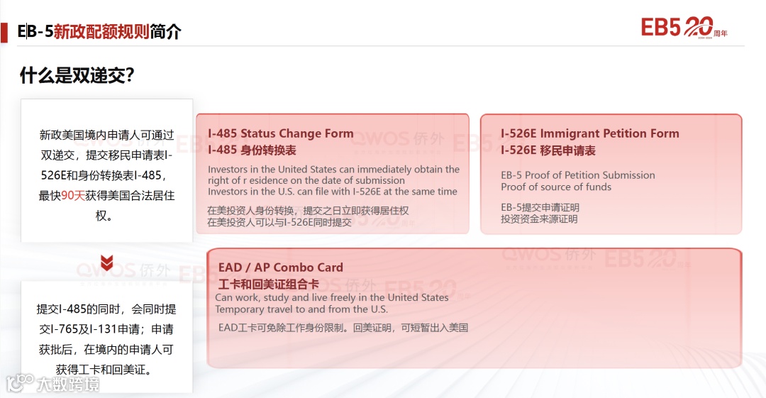 值得一提的是,在当前签证无排期的前提下,美国境内申请人满足相关居住要求,可以同时递交I-526E移民申请和I-485身份调整申请,进而获得Combo卡——5年期EAD工卡及回美纸,仅需3个月即可解决留美身份,自由在美国工作、生活。